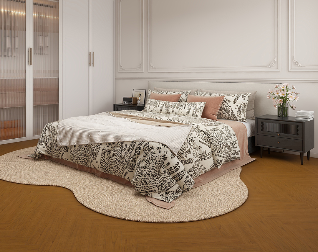 以人字拼工艺,捕捉黄昏时分的流动光影。温暖的黄棕色柚木皮在“人”字形结构中交错延伸,如同夕阳在波光粼粼的湖面上洒下的金色足迹,营造出充满艺术气息的温暖栖所。